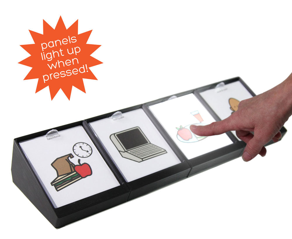 本体のターゲットを直接押して操作できますが、外部スイッチを使ったスイッチスキャン操作にも対応しています。(押したいボタンが光った時に外部スイッチを押して操作)