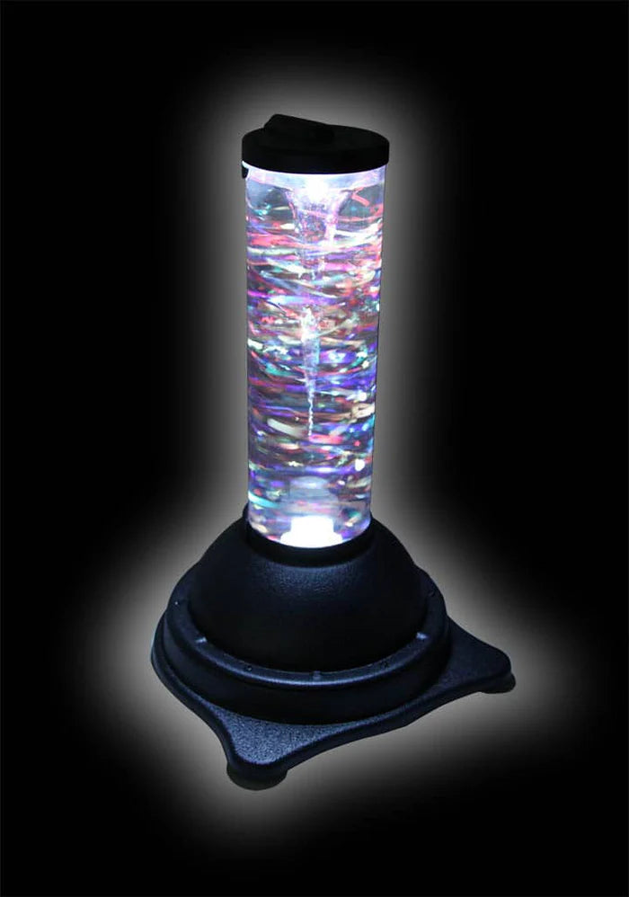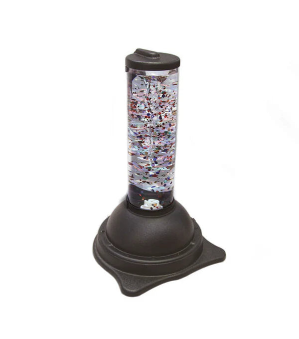 スイッチを作動させると、渦を描きながら動く色とりどりのきらめく粒と、やさしく流れる音楽によって、視覚と聴覚の両方に働きかける感覚刺激を提供します。